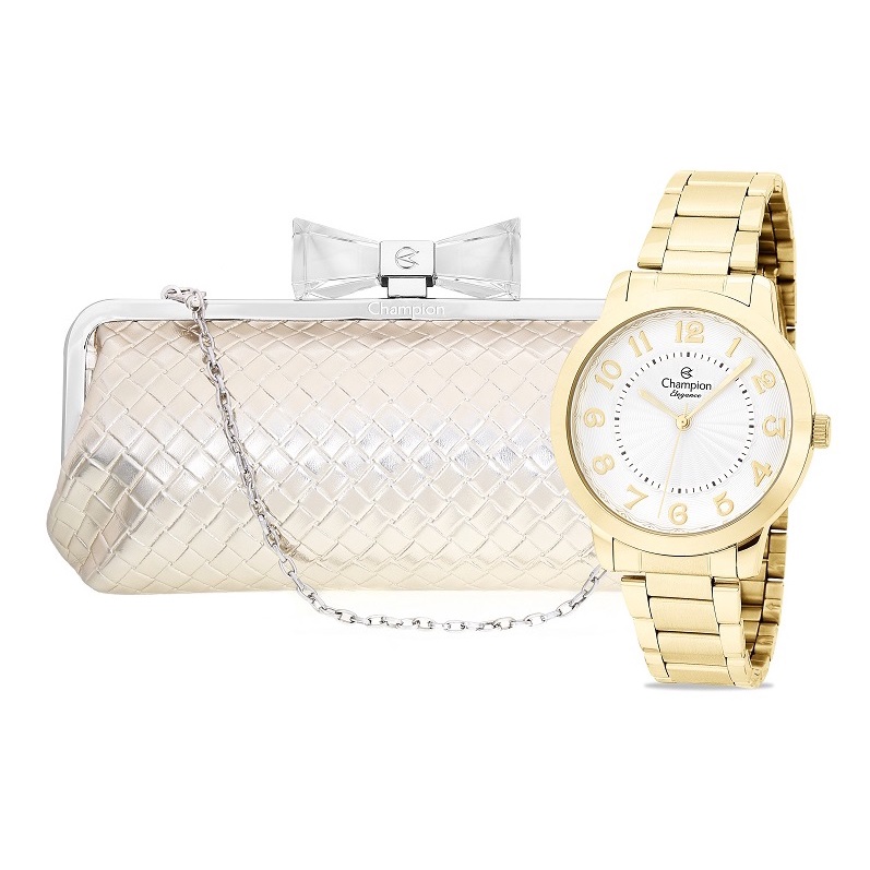 Relógio Champion Feminino Analógico Dourado + Bolsa Clutch Original À Prova D'Água Presente Moda Gift Aniversário Tendência Estilo Mulher Esposa Namorada Mãe Barato CN25118G