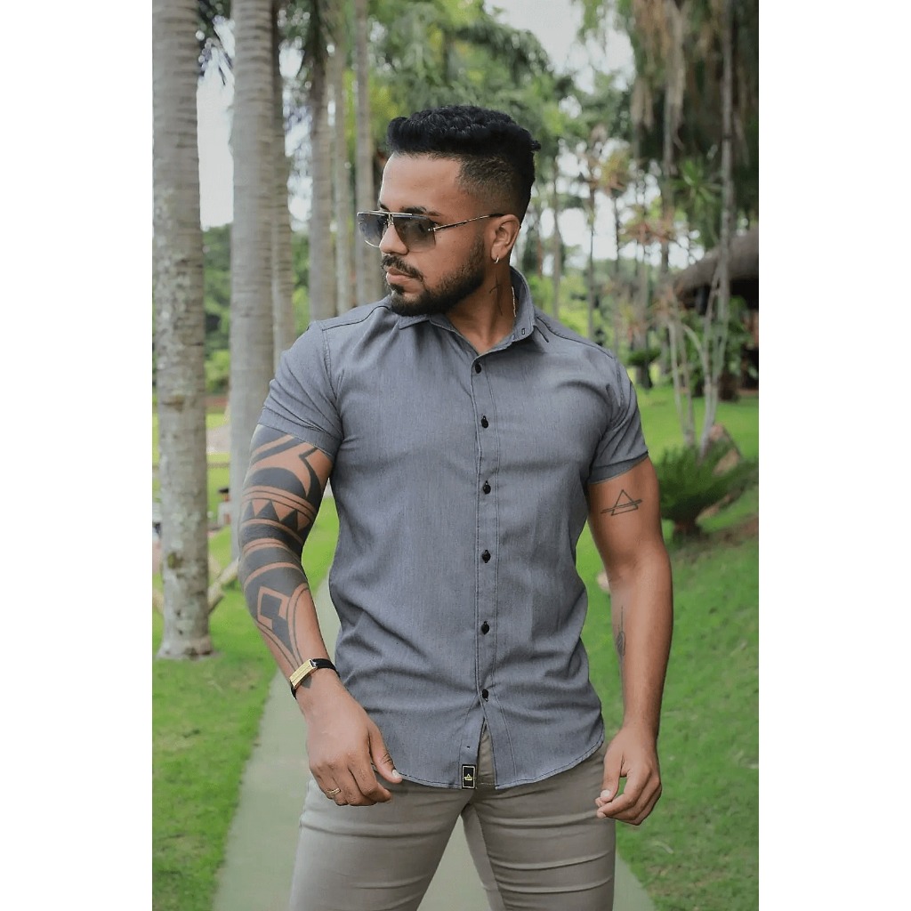 Plus Size Camisa Jeans Social Masculina Slim Fit Com Botões Clássico para Casual College Trabalho