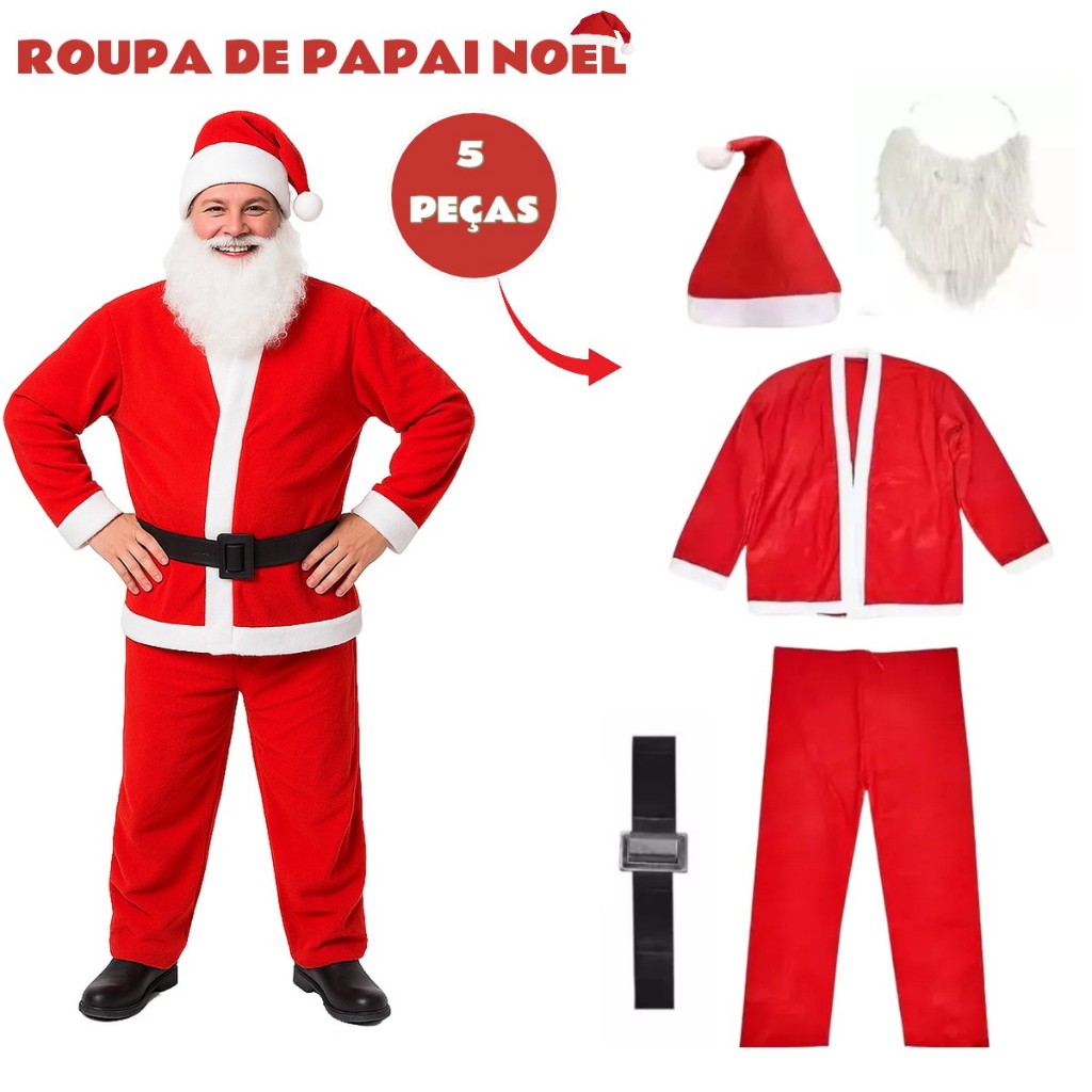 Roupa Fantasia de Papai Noel de Feltro Luxo Tamanho Único com Blusão, Calça, Gorro, Cinto e Barba 5 Peças + Envio Rápido e Garantia