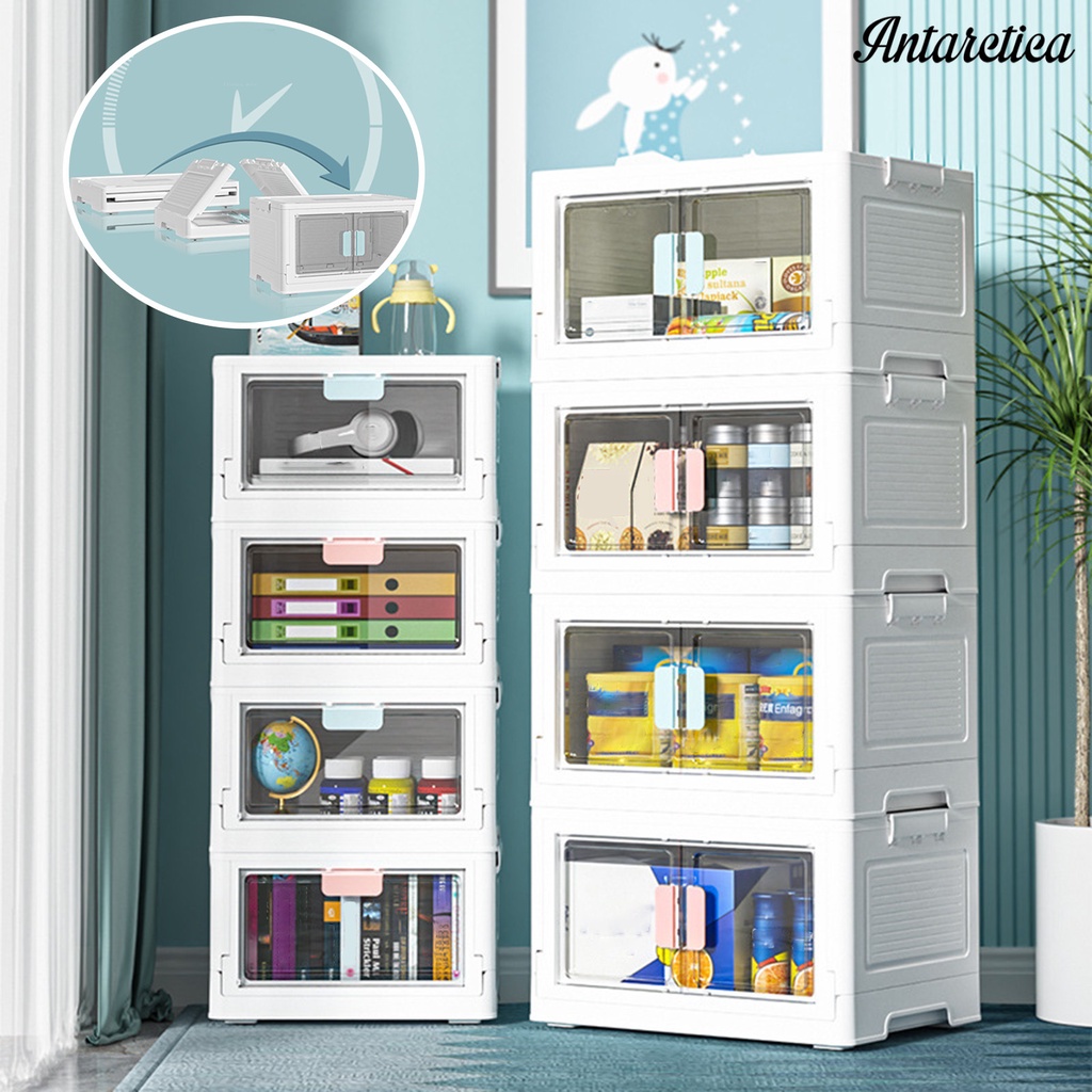 [AAI] Caixa De Armazenamento De Livros Dobrável Transparente De 4 Rodízios Com Tampa Flip Frontal Empilhável Para Crianças Organizador De Brinquedos Casa Suprimentos