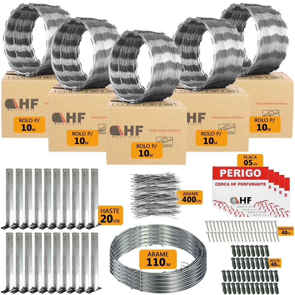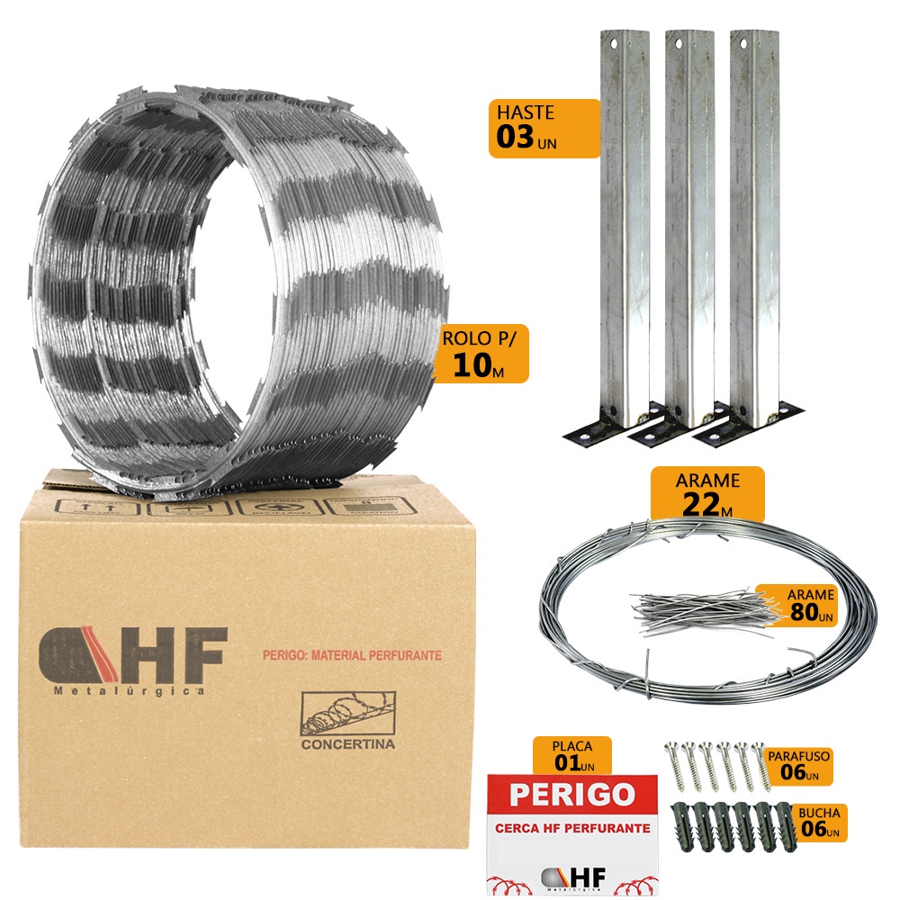Cerca concertina simples galvanizada 30cm 10 metros com kit - HF CENTRAL