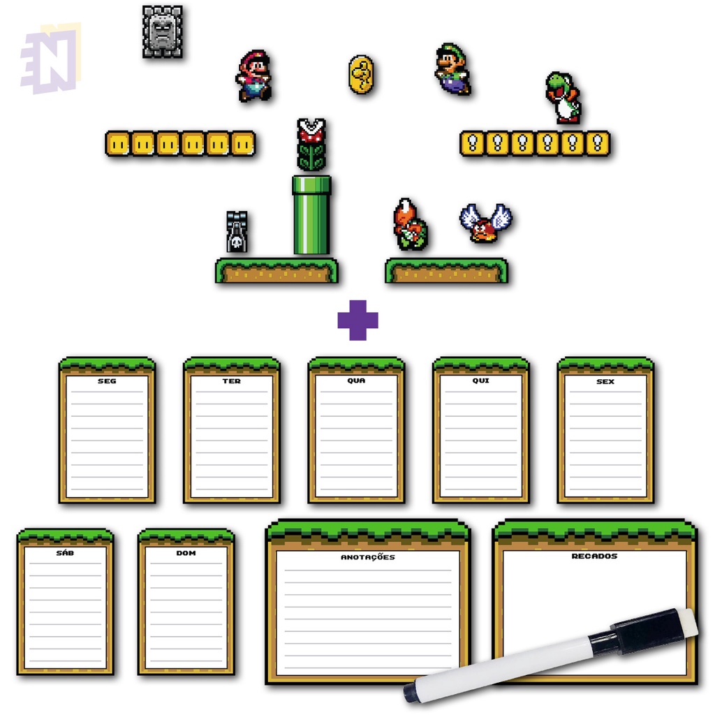 Ima De Geladeira Porta Recados Anotações Super Marios Bros c/ Caneta e Kit Cenário