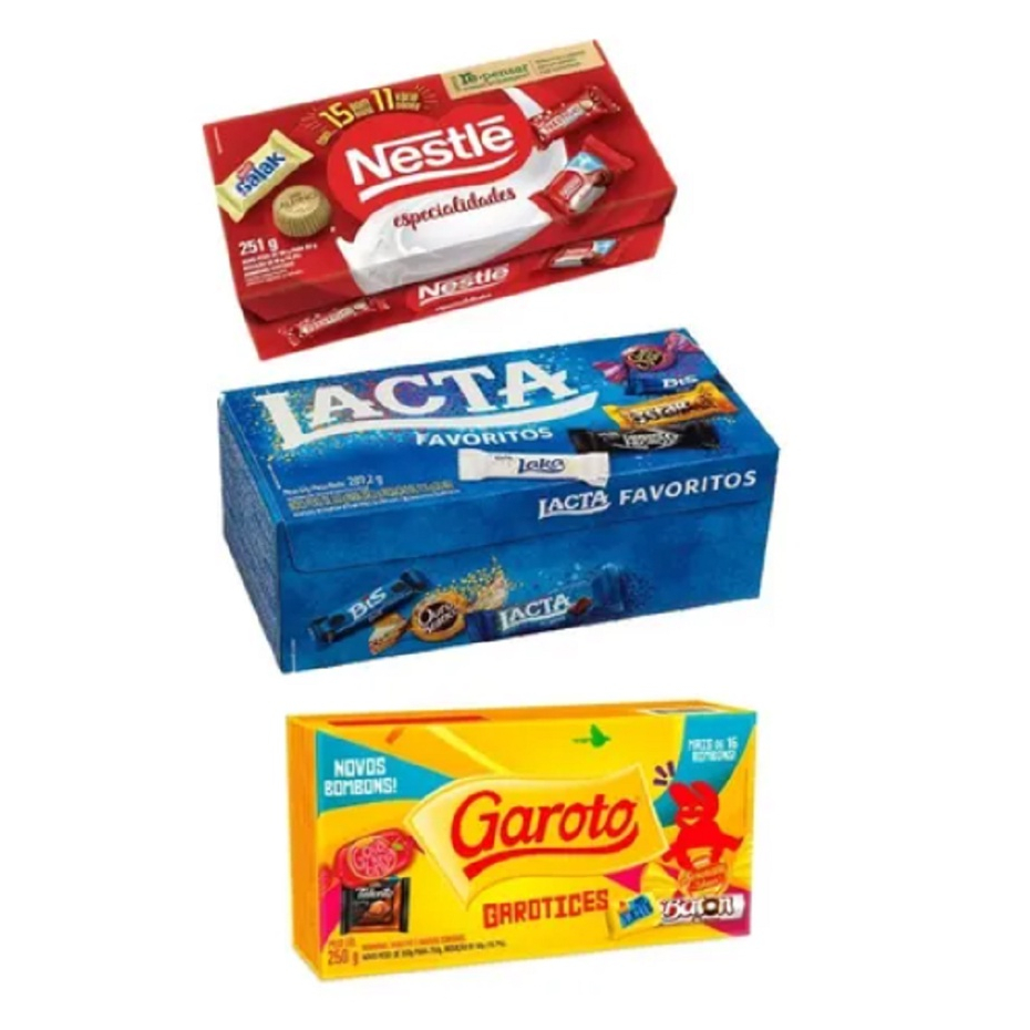 KIT BOMBONS CHOCOLATES SORTIDOS GAROTO GAROTICES 250G NESTLE ESPECIALIDADES 251G LACTA FAVORITOS 250G PASCOA GRATIS 3 SACOLAS DE PRESENTE