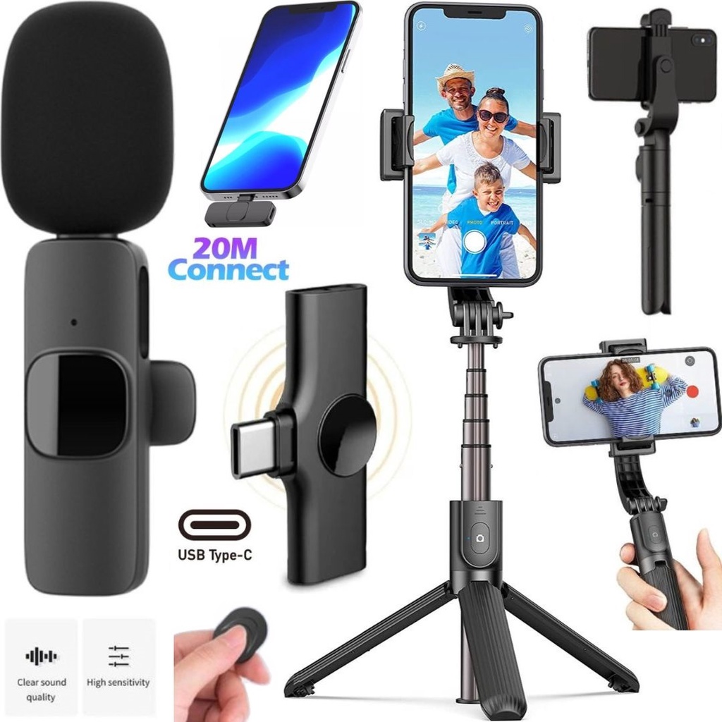 Kit Microfone Lapela Sem Fio Receptor Tipo-C Bastão Tripé Para Celular Smartphone