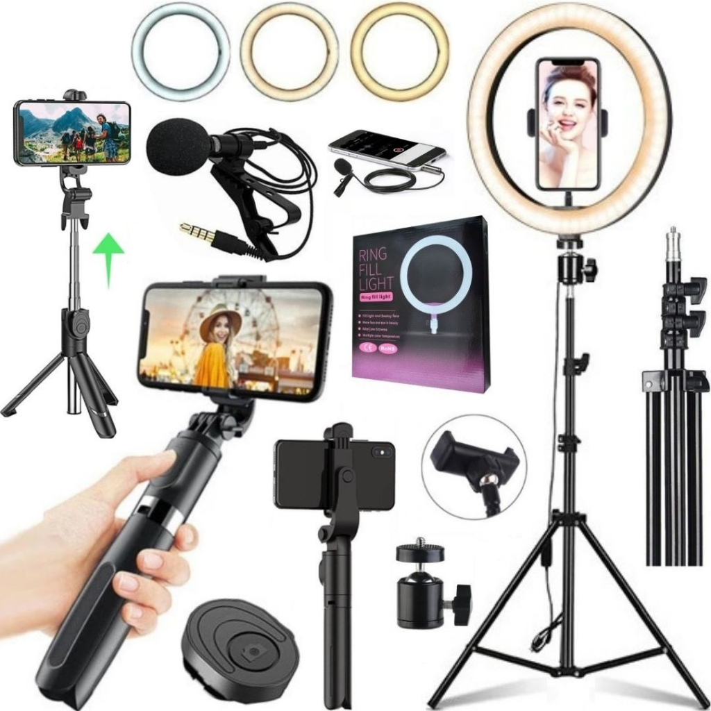 Kit Completo Luz Ring light + Tripé 2m Microfone Suporte Celular Acessórios Vídeo 14pçs