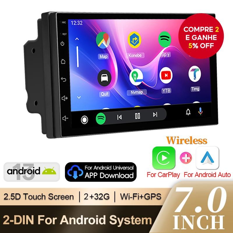 Android 13 Rádio Multimídia 2 Din Carplay sem fio Android Auto Áudio 2GB + 32GB GPS Universal Wi-Fi