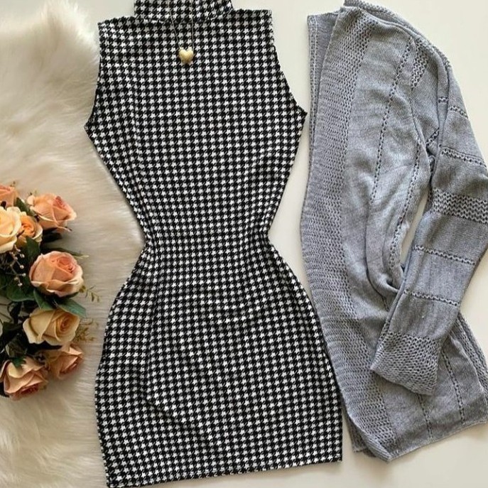 Vestido feminino gola alta cavado sem manga curtinho pied poule canelado tubinho