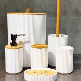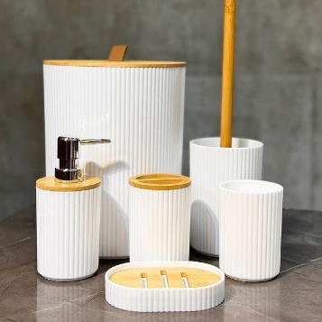 Conjunto 6 Peças Pra Banheiro Bambu Saboneteira Conjuto Lavabo Lixo De Banheiro Acessorios Utensilios Para Casa