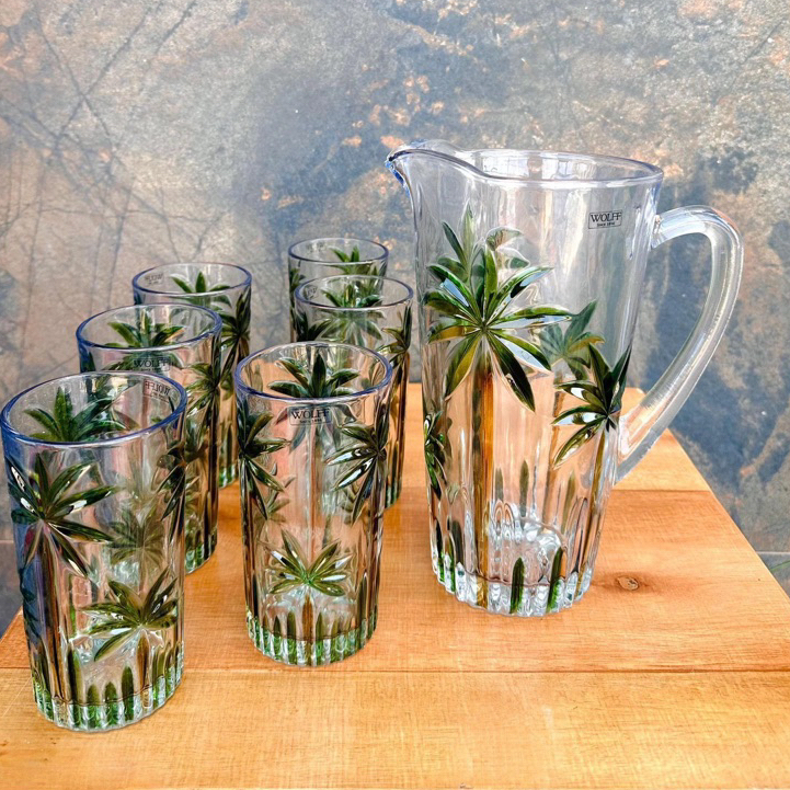 Conjuto Jarra Palmeiras 1,2L e 6 Copos 360ml De Cristal Palm Tree Coqueiros Vidro