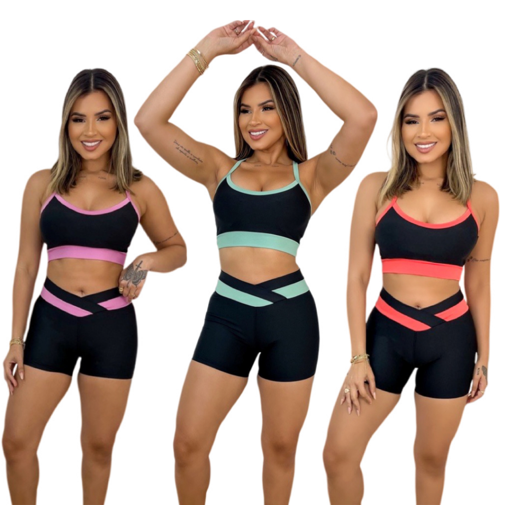 KIT 03 Conjuntos Bicolor Suplex Sofisticado Short + Top COM BOJO Para Academia Fitness Crossfit