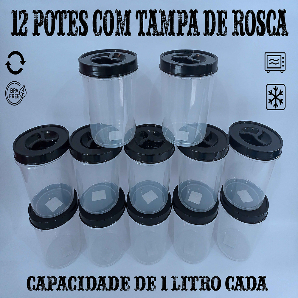 kit 12 potes plásticos com tampa de rosca 1 litro cada