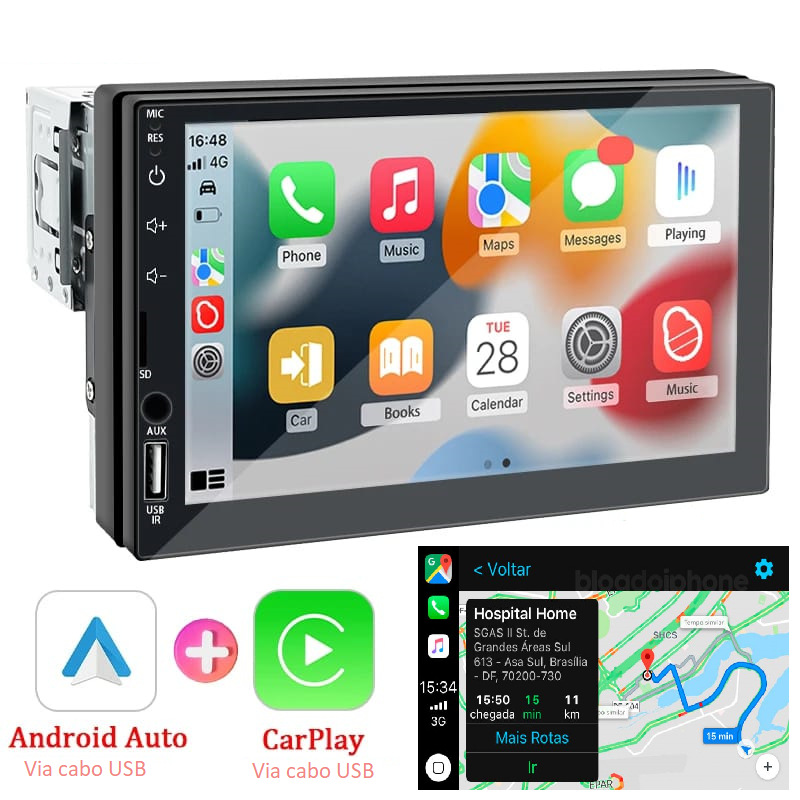 Central Multimídia 1Din Invertido 7 Pols, Android Auto, Carplay, Espelha Celular, Bluetooth, FM, USB