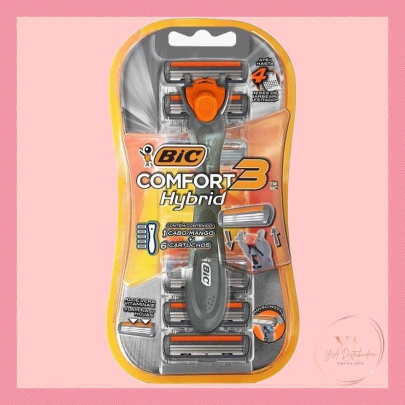 Aparelho de Barbear BIC Comfort 3 Hybrid Cabeça Móvel - 01 Barbeador Cabo Ergonômico + 06 Cartuchos Refil 3 Lâminas PRESENTE MASCULINO DIA DOS PAIS