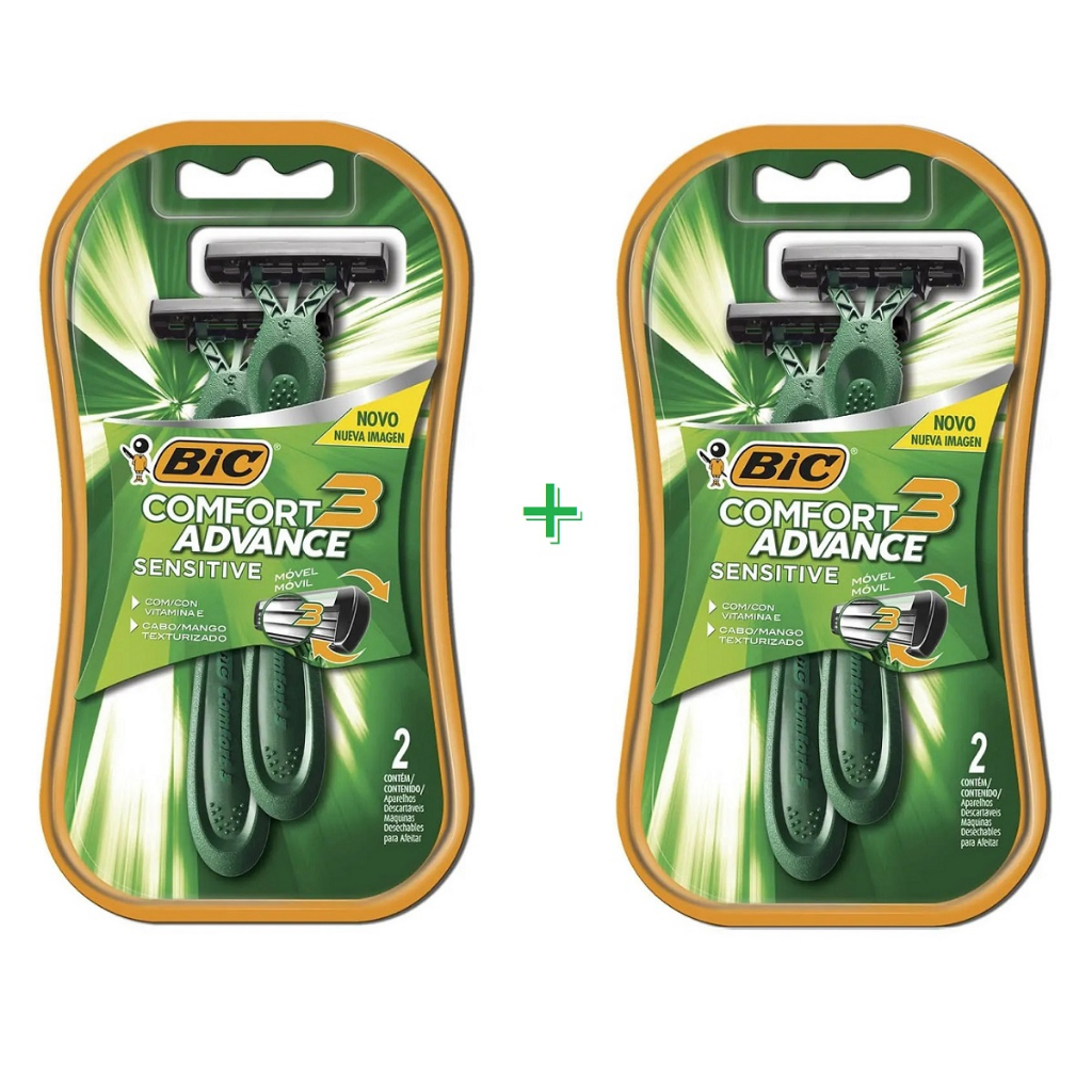 Kit 4 Un - Aparelho de Barbear BIC Comfort 3 Advance Sensitive, Pele Sensível, 3 Lâminas, Verde, Fita Lubrificante, Barbeador - BT 2 UN