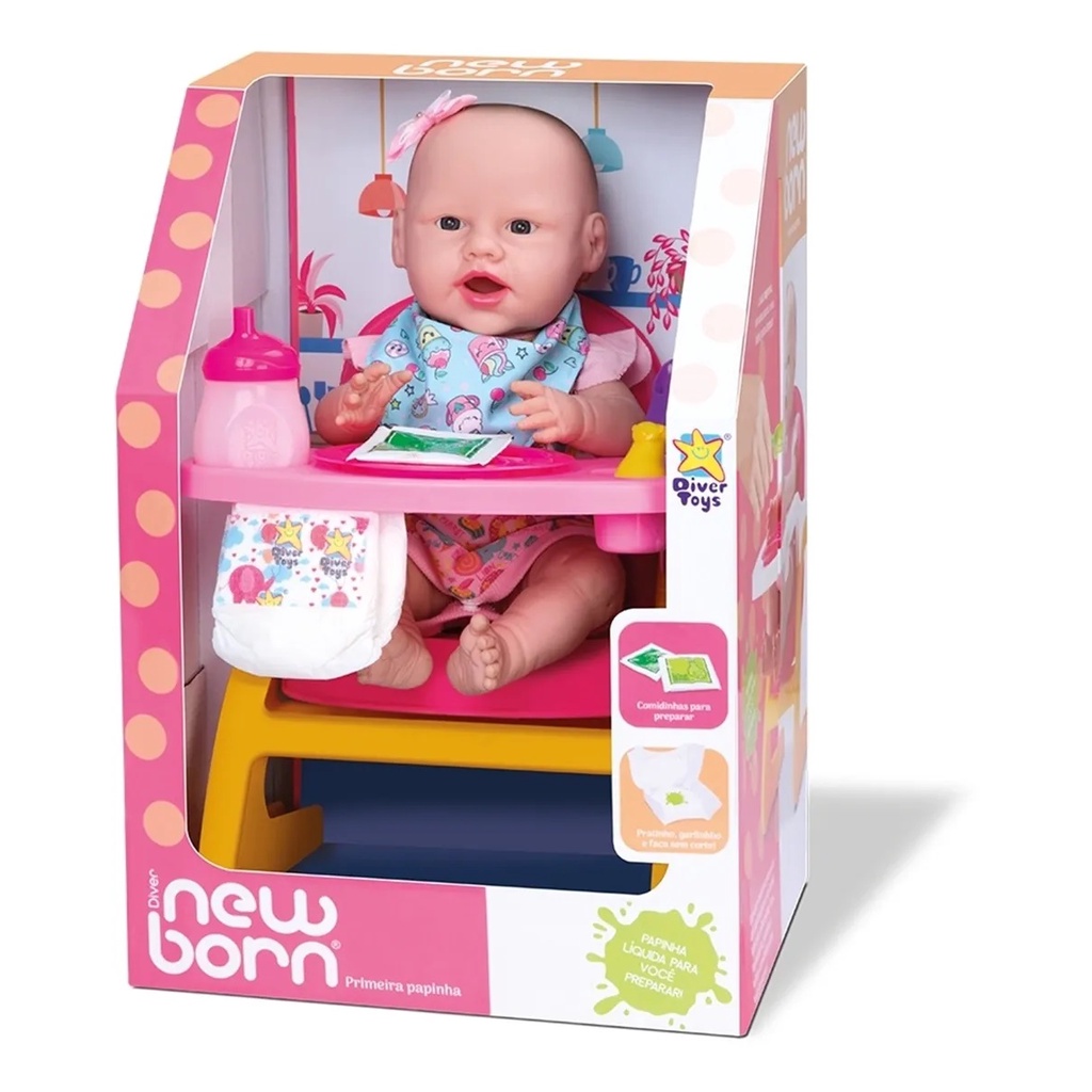 Boneca New Born Come Papinha e Faz Caquinha c/Cadeira De Papá- Divertoys