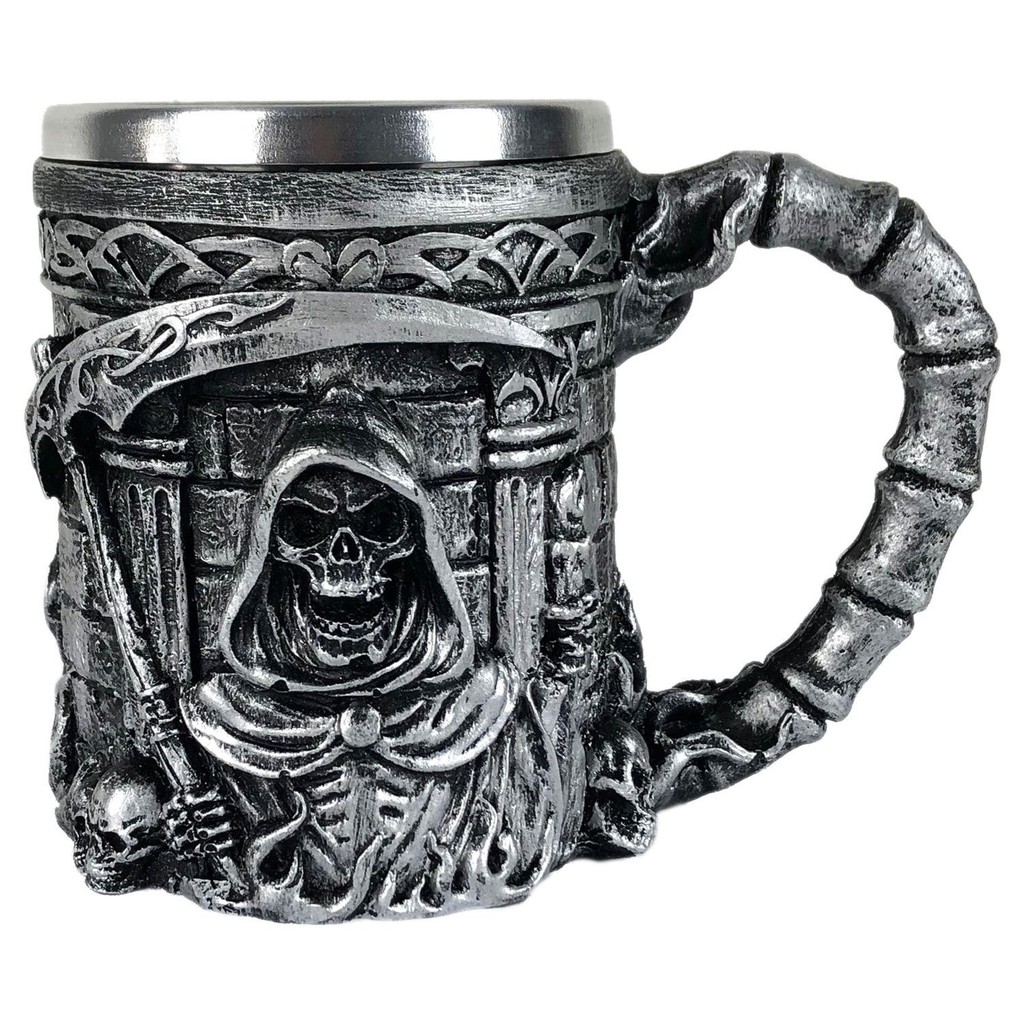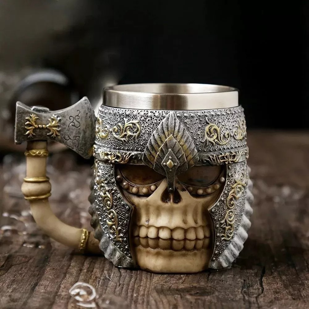 Caneca de resina e aço inox caveira crânio viking medieval Chopp cerveja 400ml festa rock