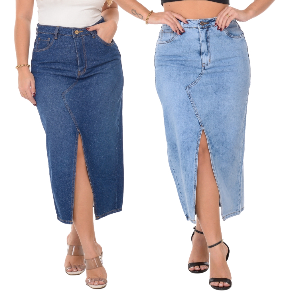 SAIA MIDI JEANS FEMININA COM FENDA 100% ALGODÃO