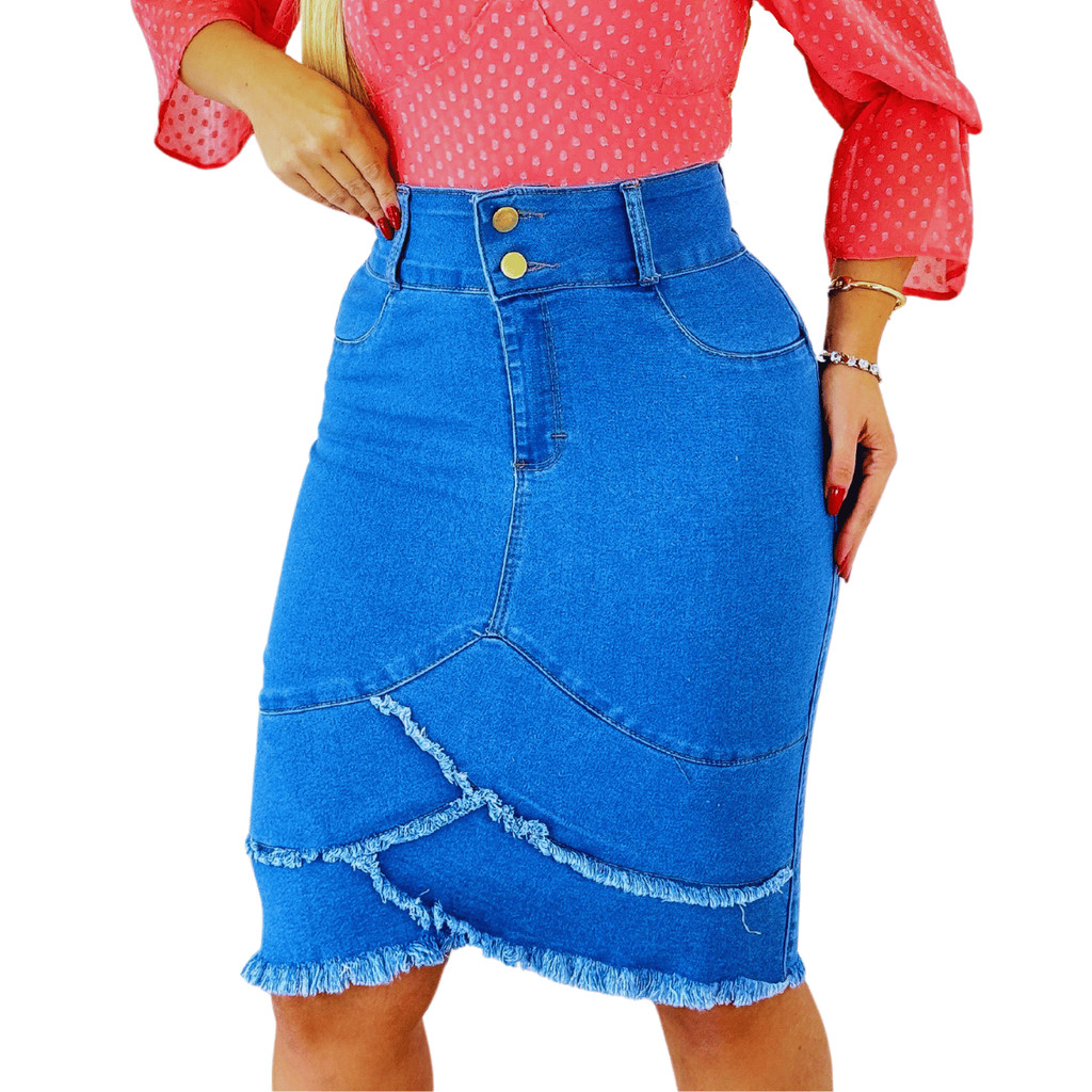 Saia Jeans Feminina Longa Com Fenda Evangélica Secretária 100% Algodão