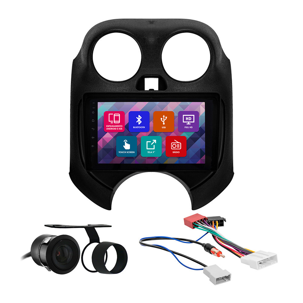 Kit Multimídia 9 Pol March 2010 2011 2012 2013 2014 Espelhamento Android Ios 2 Din Preto Camera Ré