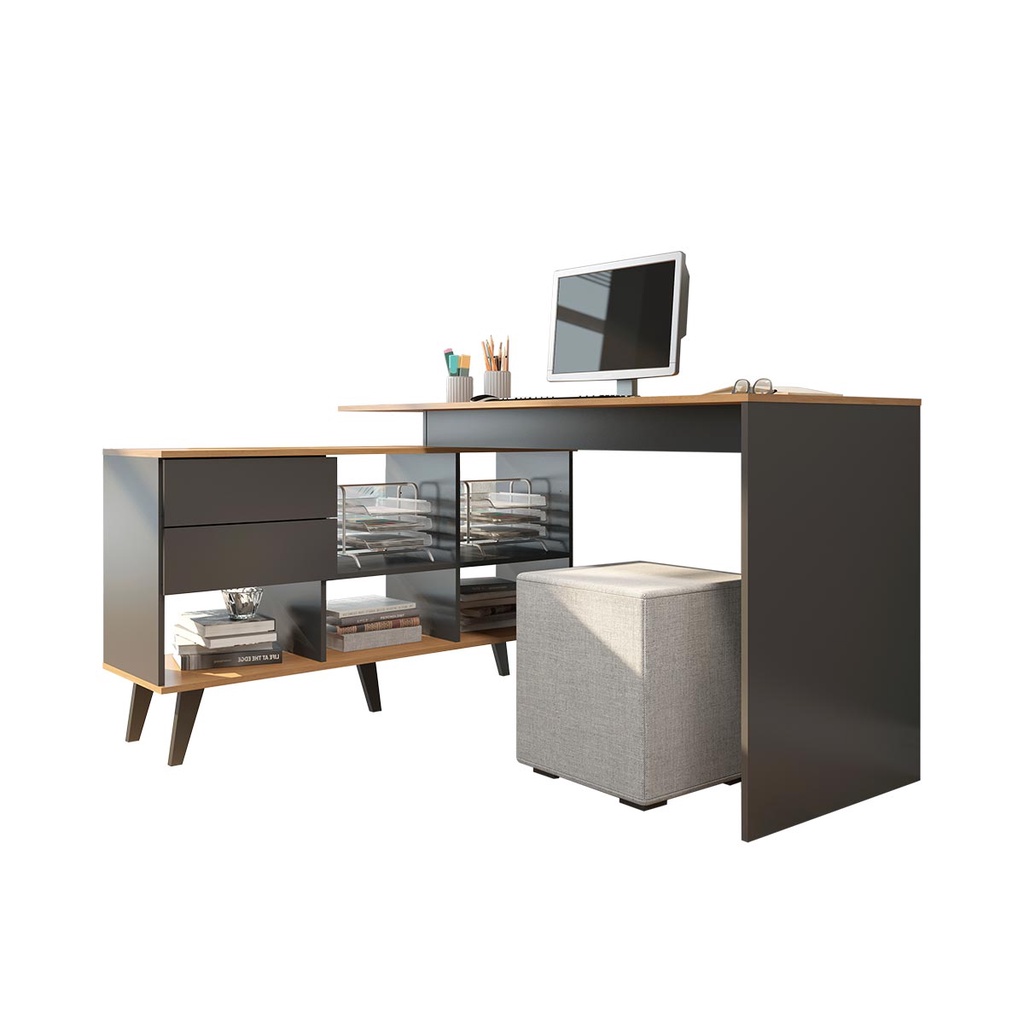 Mesa em L Home Office 128/145x84 Cm Estante 2 Gavetas Carvalho Cinza 0747 MENU