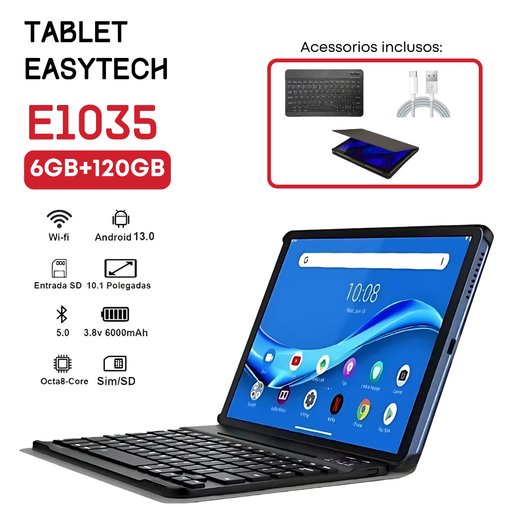 Tablet easytech E1035 com Dual sim 6gb Ram 128gb Teclado Capa 10,1 polegadas Para Estudo E Trabalho