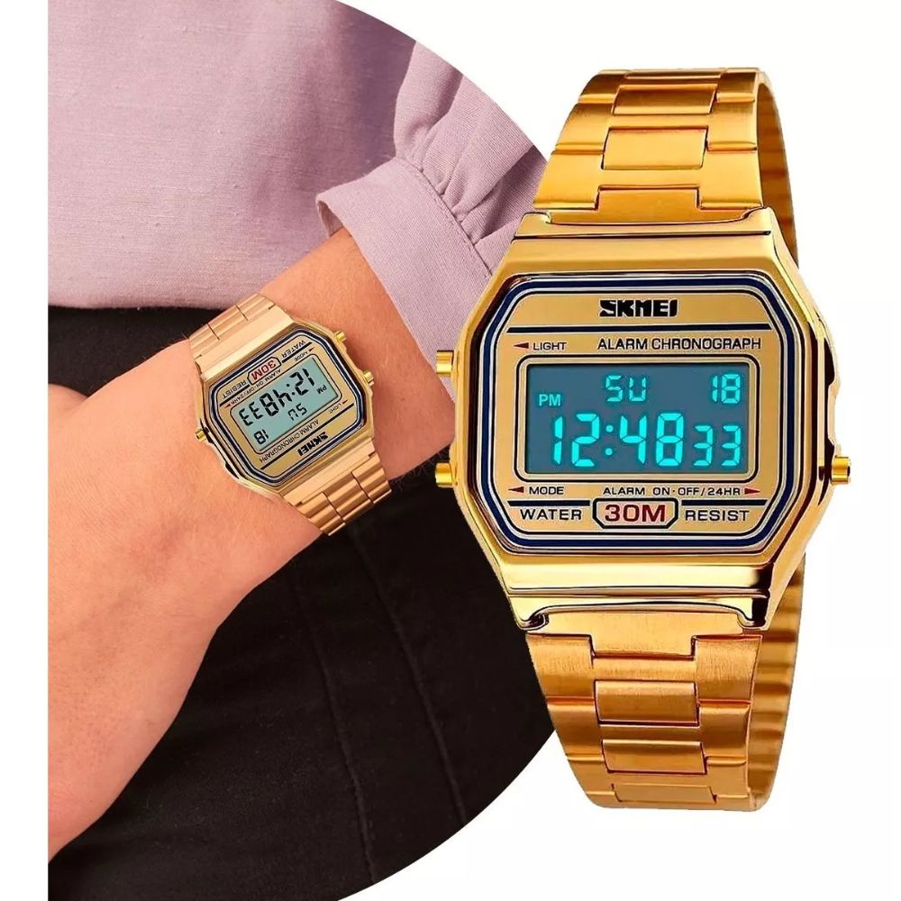 Relógio Digital Feminino Masculino Unisex Vintage Retrô de Pulso Pulseira em Aço Inoxidável à Prova D Água Dourado Skmei Original Casual Social Festa Estiloso Fashion