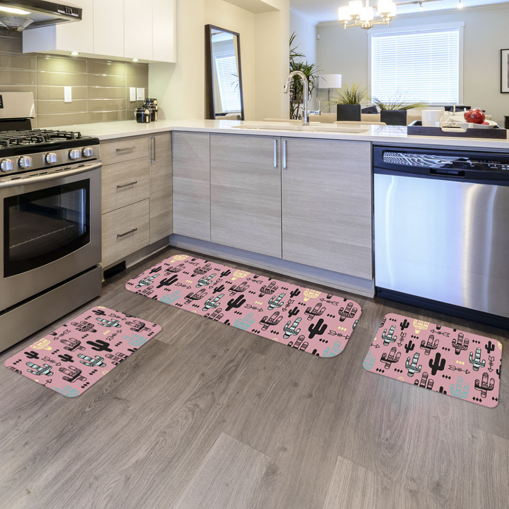 Kit Jogo 3 Peças de Tapete para Cozinha Cactos Fundo Rosa Antiderrapante Dcorô