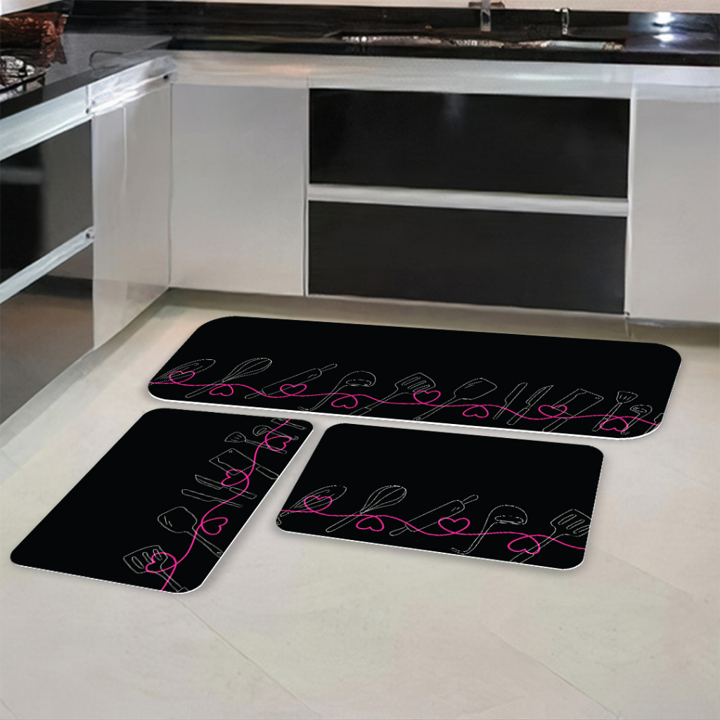 Kit Jogo 3 Peças de Tapete para Cozinha Talheres Corações Rosa Antiderrapante Dcorô