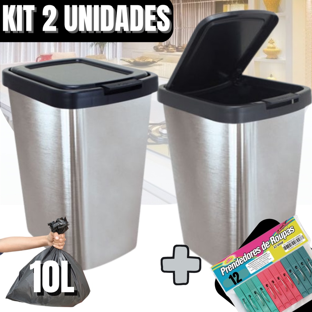OFERTA KIT 2 Lixeira Cesto de Lixo para Cozinha e Banheiro Retangular 9L Imita Inox Arqplast Tampa Abre e Fecha ENVIO IMEDIATO