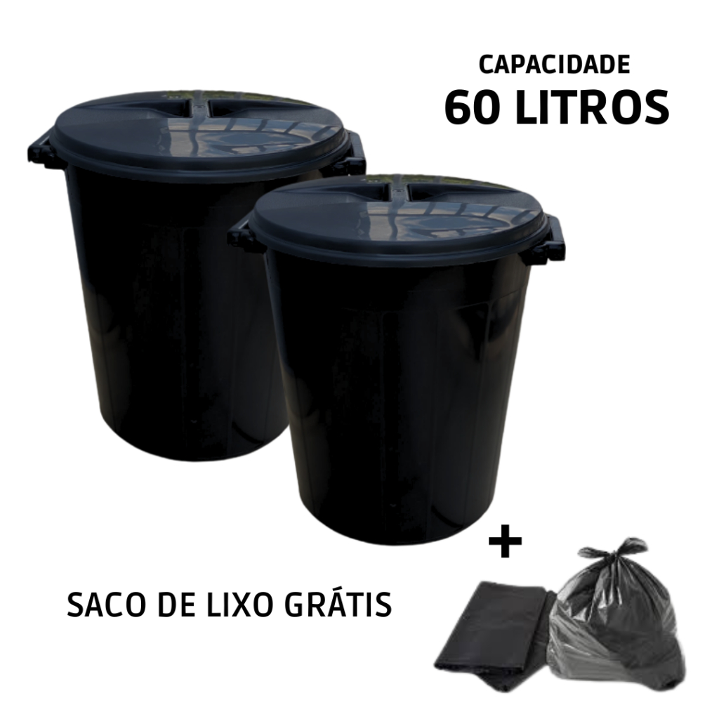 Kit 2 Cesto Lixeira 60 Litros fechado com tampa para cozinha Preto - Plasconex - Lixao Grande / Balde de Lixo