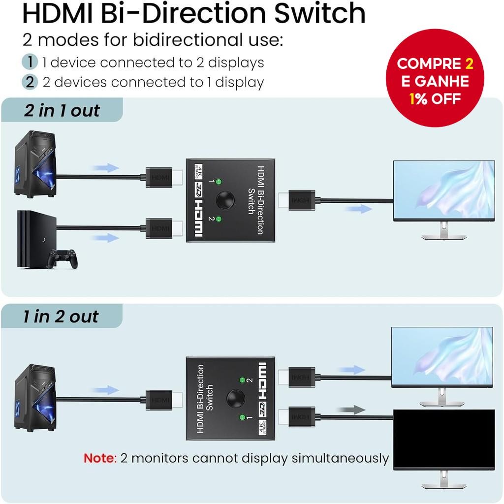 Novo Divisor HDMI Bi-Direcional 4K 1 Entrada 2 Saídas Suporte Ultra HD 4K 3D HDR HDCP