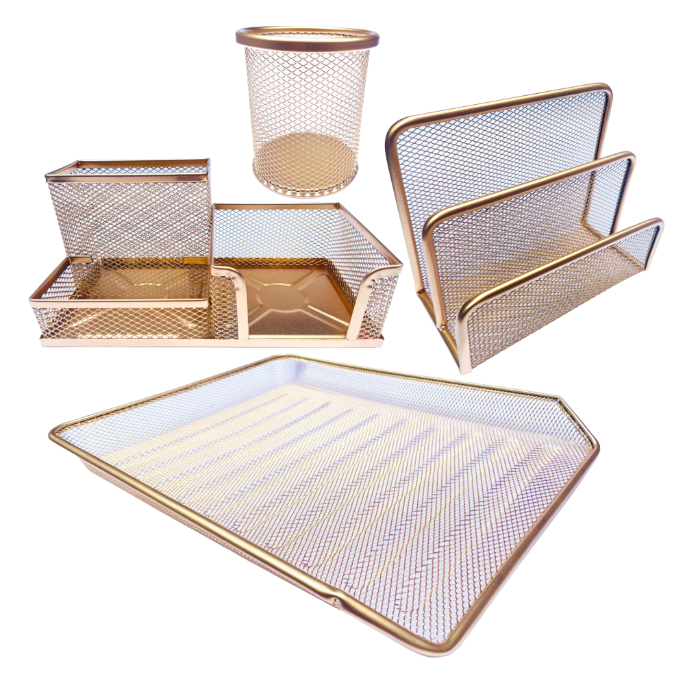 Kit Organizador De Mesa Escritório Porta Treco Bandeja Porta Cartão Caneta Lembrete Dourado