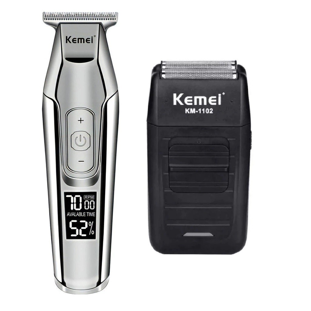 Kit Máquina Profissional Kemei KM-5027 + Barbeador Elétrico Kemei KM-1102 – Corte, Aparar Pelos e Barba Bivolt Original