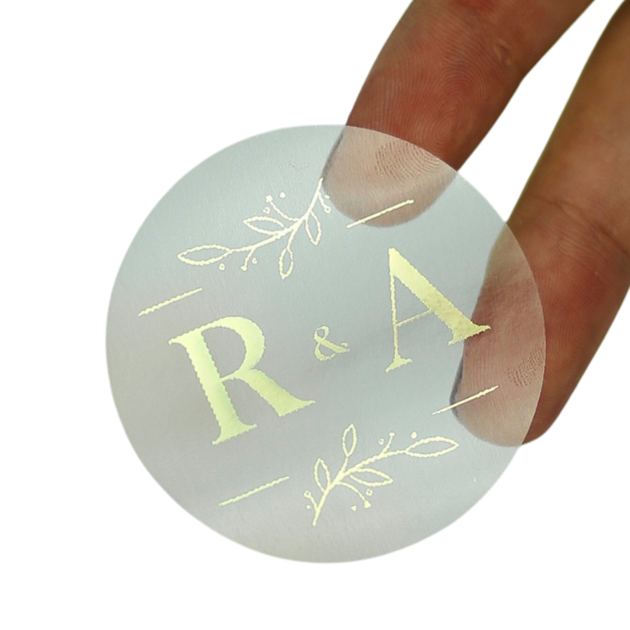 250 Adesivos transparentes com dourado com sua marca logo em hot stamping 5 x 5 cm