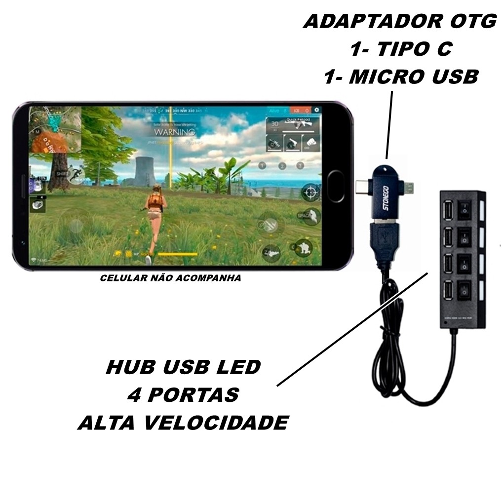 Conversor Celular Gamer Hub Usb 4 Portas + Adaptador Otg C + Suporte Tripé Kit Mobilador Pronto Pro Jogo