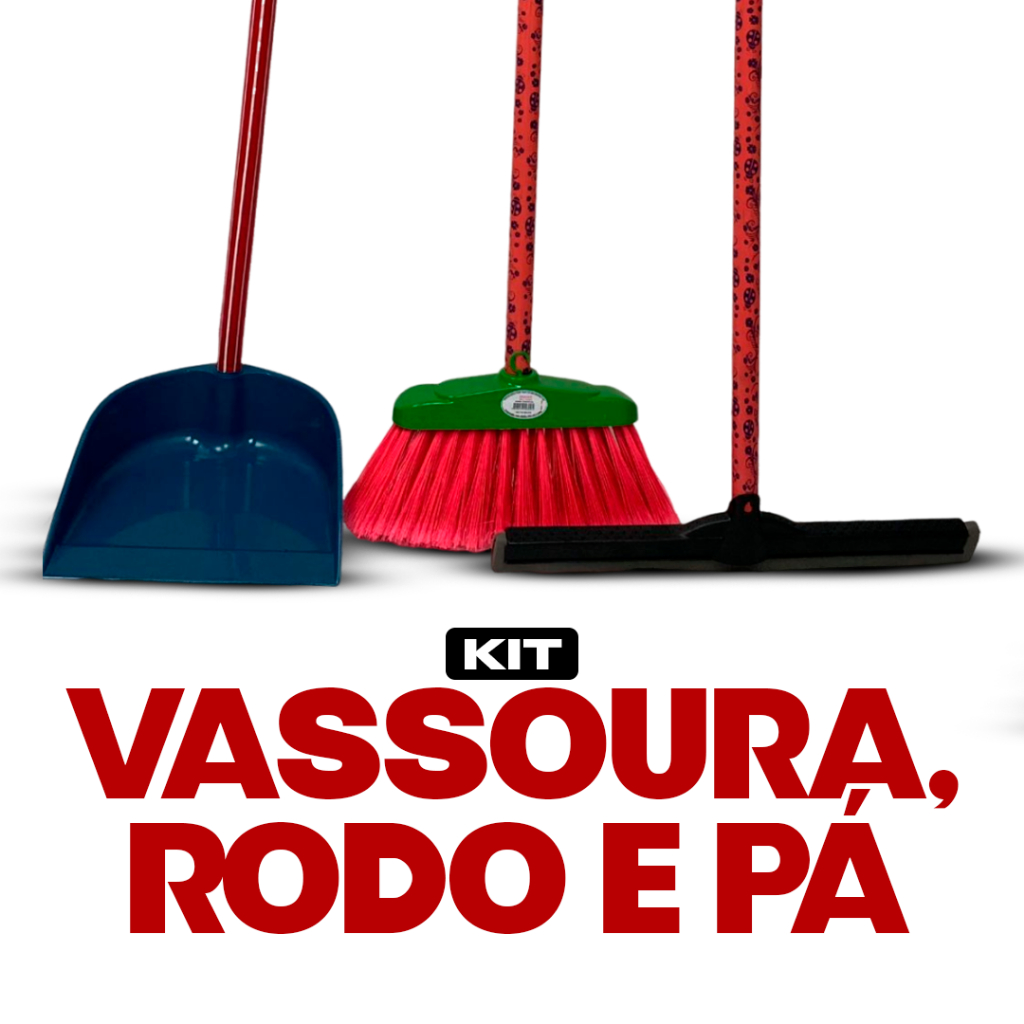 Kit 1 Vassoura (Com cabo), 1 Rodo (Com Cabo), 1 Lava (limpa) Azulejo (Com Cabo) e 1 pá de lixo (Com Cabo) - Rochinha Varejo