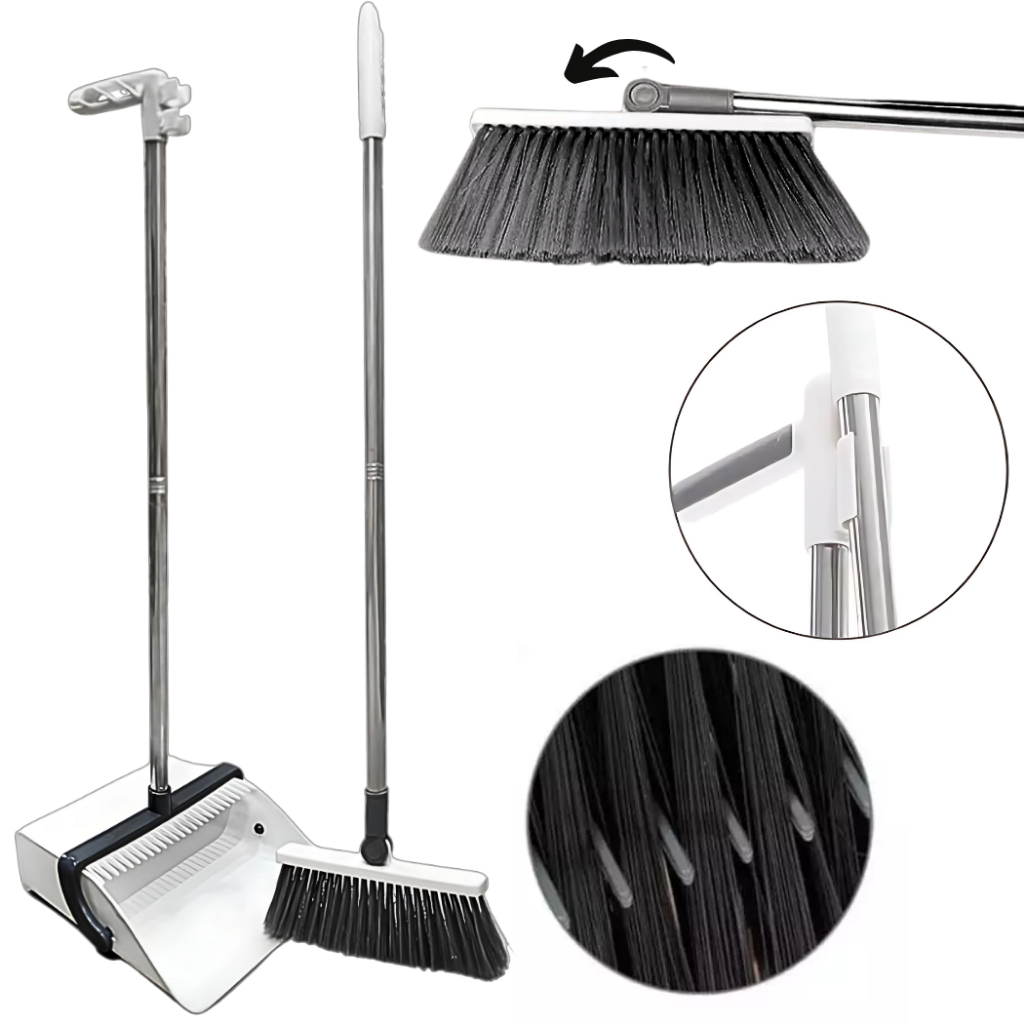 Kit Vassoura e Pá Ajustável 2in1 Com Limpa Cerdas Suporte Parede Compacto Ambientes Pequenos