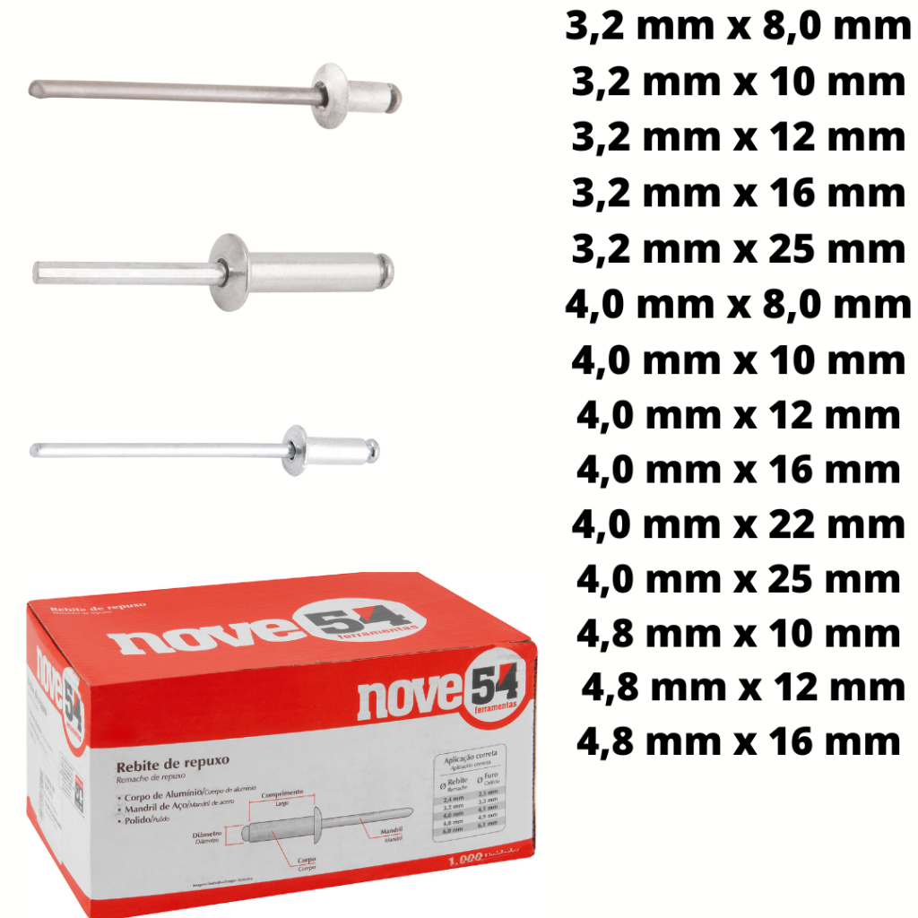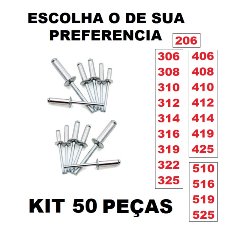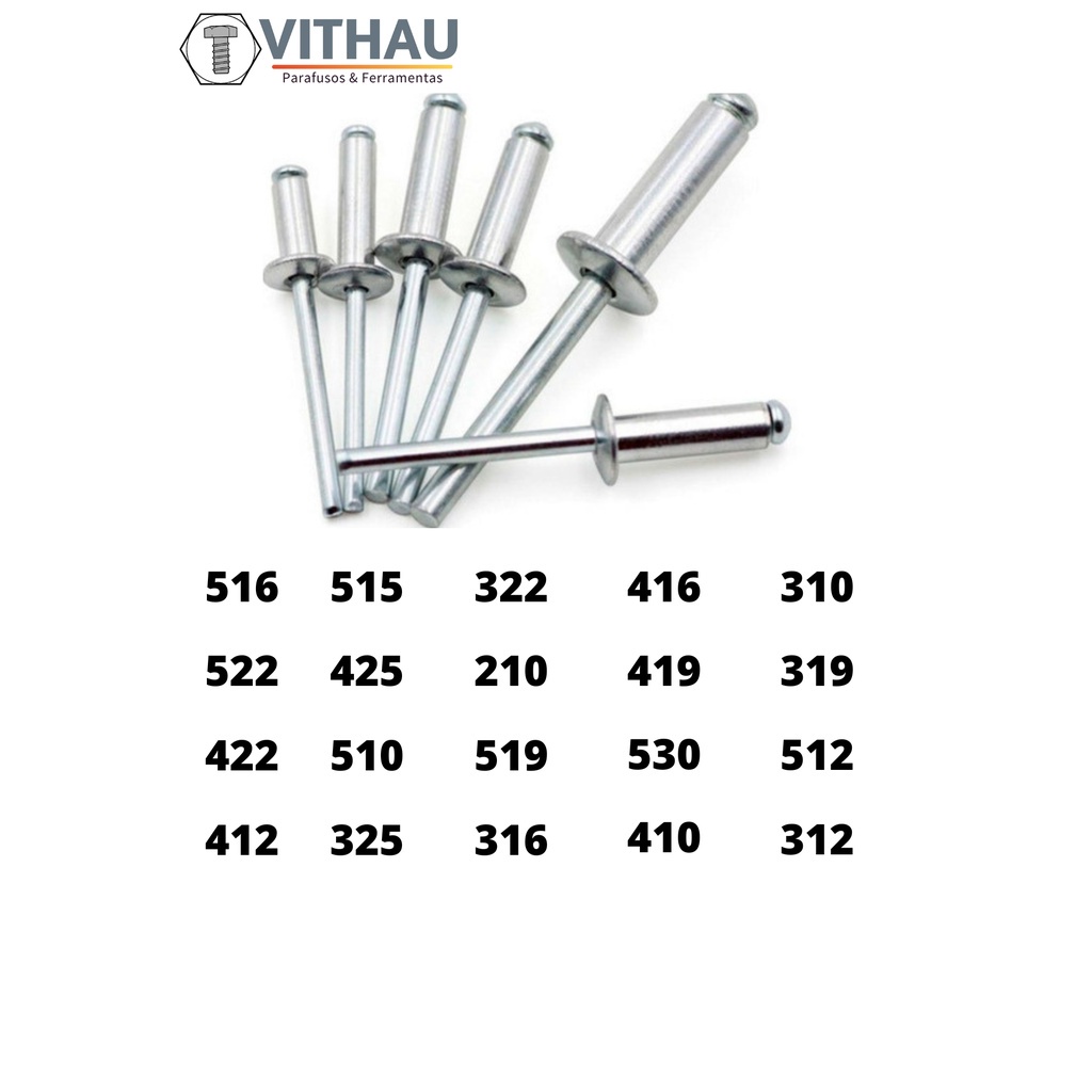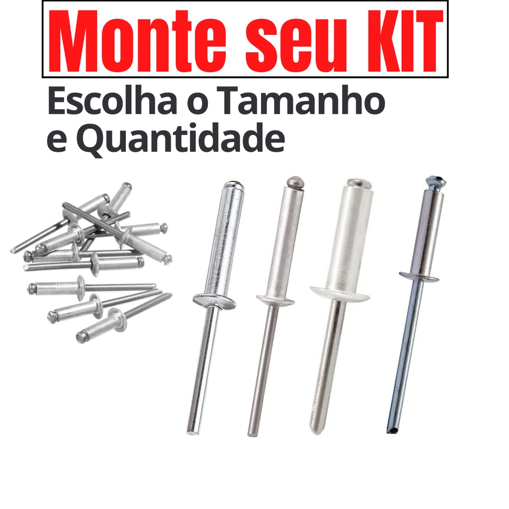 Rebite Repuxo Pop ALuminio Kit 310 - 312 - 319 - 325 - 410 - 412 - 419 - 525 - 619 com 10 - 50 - 100 Rebites Pop Repuxo