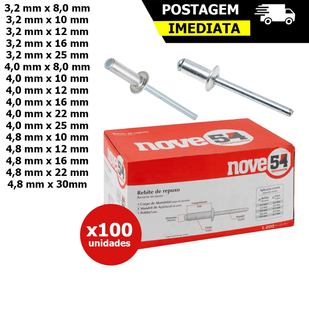 Rebite Pop Repuxo Alumínio Diversos Tamanhos - KIT 100 PEÇAS
