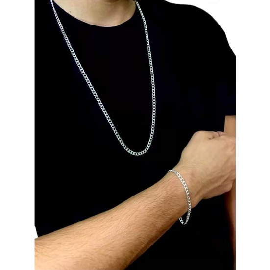 Corrente Cordão Com Pulseira Banhado Prata 925 Masculina 60Cm-70cm 4mm Modelo 3x1