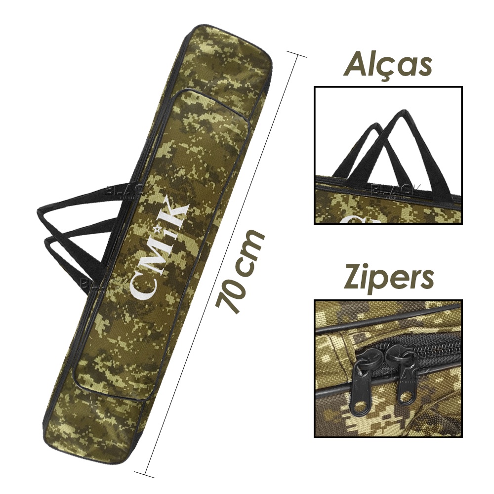 Bolsa Estojo Porta Vara de Pesca 70cm 3 Repartições Alça de Mão e Costa Camuflada Semi rígida