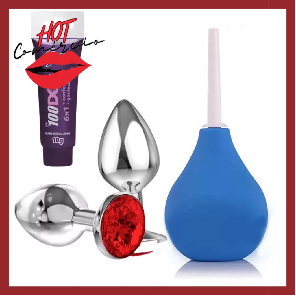 Kit Sex Shop Plug Anal Aco Inox Joia + Gel Lubrificante Intimo Sexual Anal + Ducha Intima Higienica