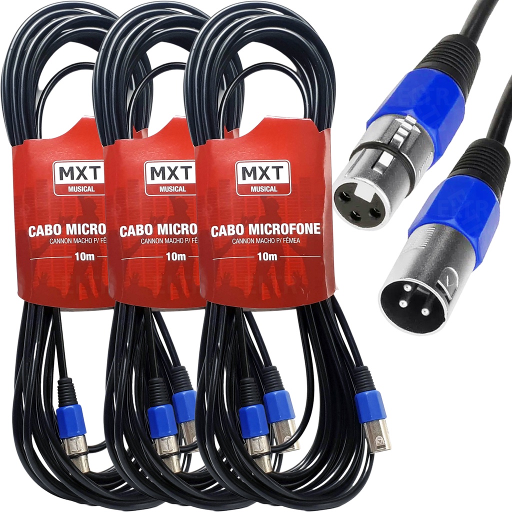Kit 3 Cabo Microfone Xlr Canon Balanceado Macho Femea 10m Metros Mxt