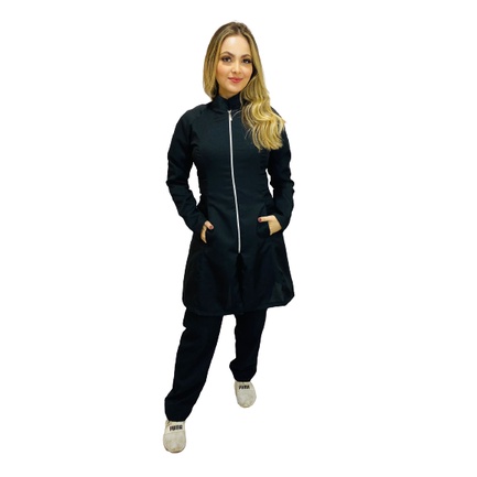 Jaleco Feminino Oxford Preto Ziper Gola Padre Manga Longa Com Punho Plus Size Acinturado