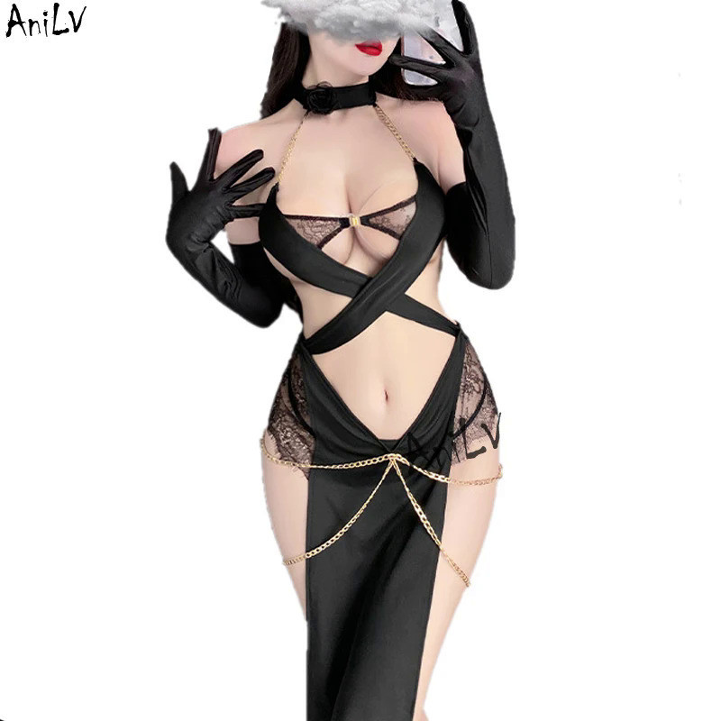 AniLV-Cosplay Catgirl Halloween para Mulheres, Gato Malvado, Tira Cruzada, Corrente Dourada, Vestido de Amuleto, Temperamento, Pijama, Roupas