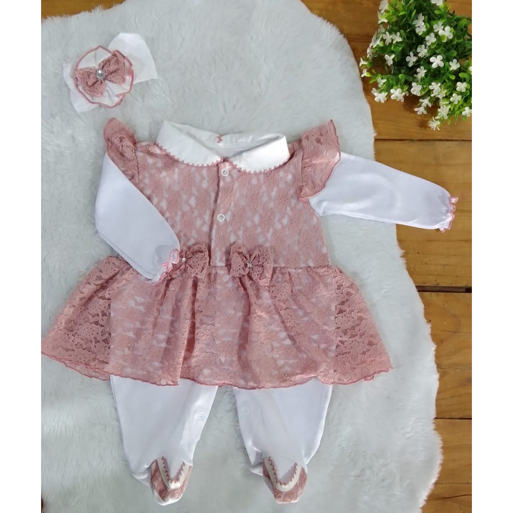 Macacão Longo de Malha com Renda para Bebê Manú Salmão 03 peças