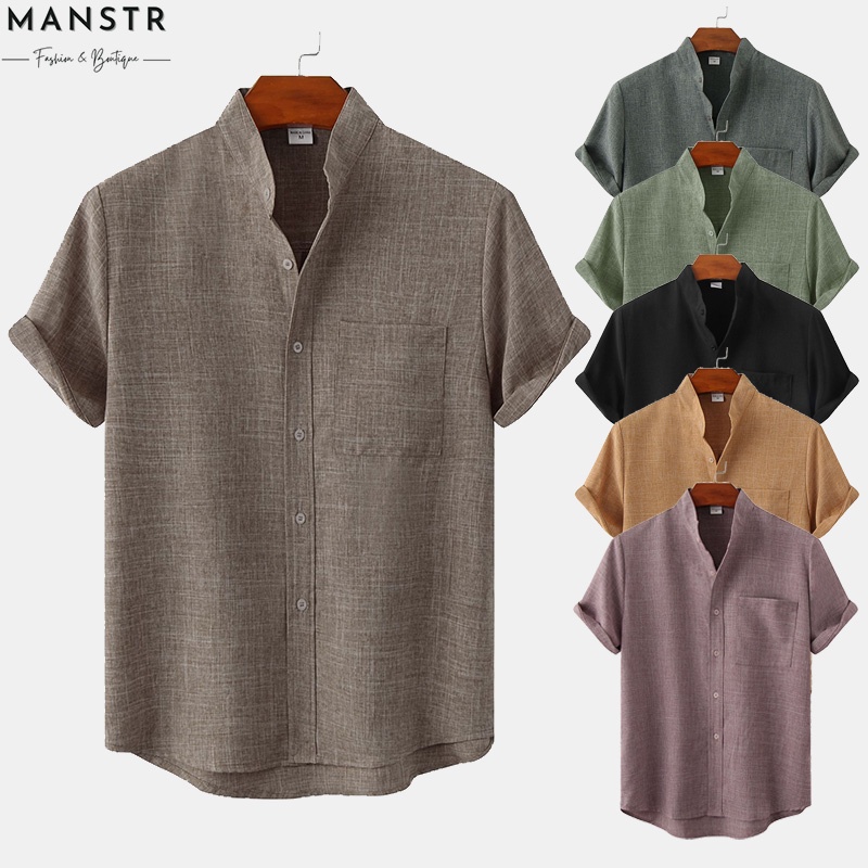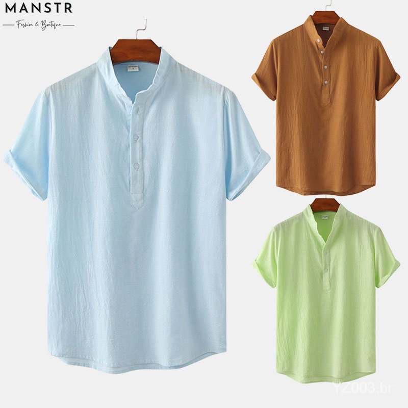 Simples manga curta camisa de linho pulôver botão gola casual marrom/cáqui/azul claro/verde/café/branco/preto