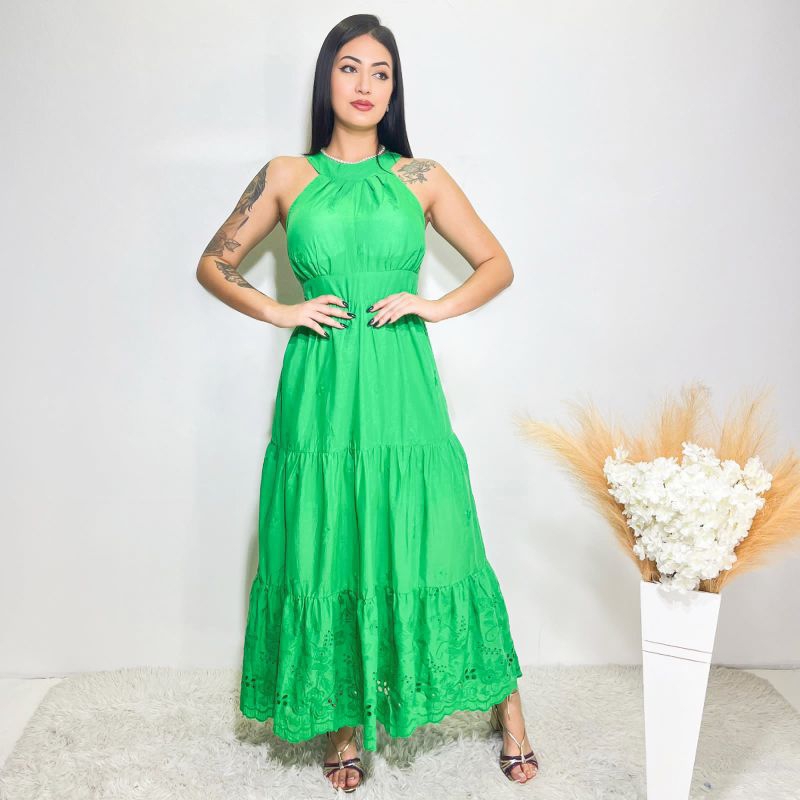 vestido longo luxo lisa lese bordado Gola alta