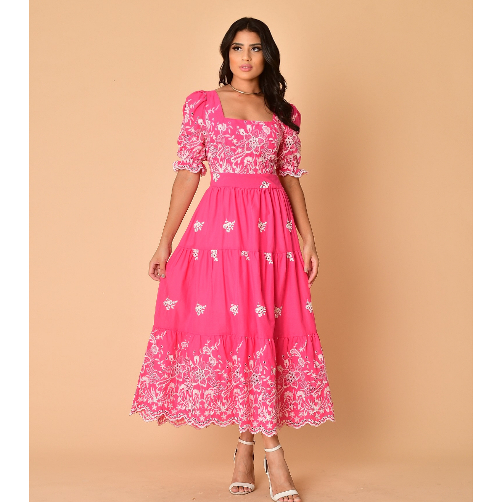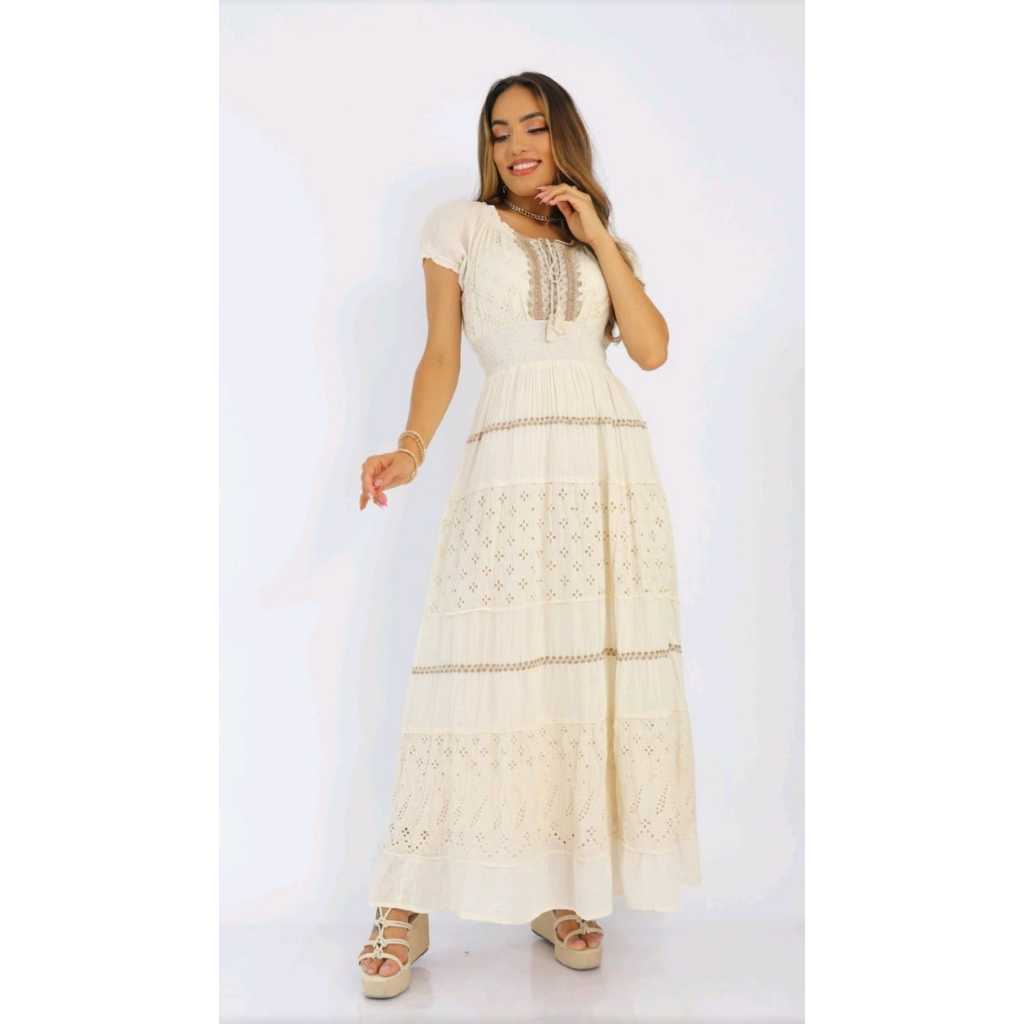 Vestido Lasie Bordado 100% Algodão Longo Casual Luxo Romantico Moda Cristã Evangelica Tres Marias Manga Princesa Lancamento