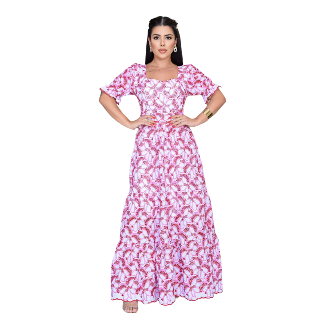 Vestido longo luxo lese bordado algodão manga curto 0286